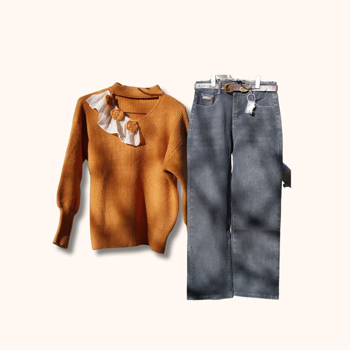 What defines this orange knit sweater combo? This is a deliberately matched pairing featuring a ruffle collar sweater set with decorative details and charcoal wash straight-leg jeans that provide versatile foundation—two pieces I’ve repeatedly recommended to clients building functional winter wardrobes without sacrificing personality.