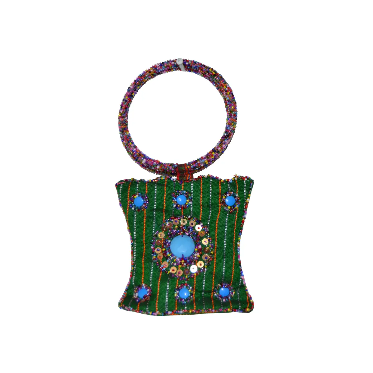 What You Get: A green-blue shisha bag featuring beaded handle, contrasting mirror work, and teal mirror handbag construction that demonstrates sophisticated color theory application.